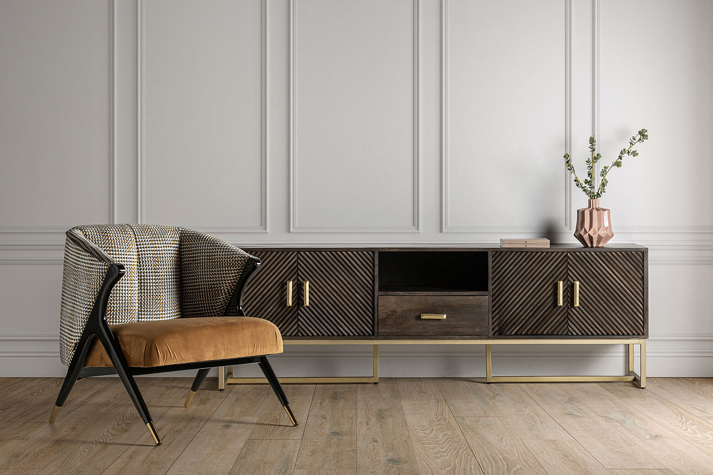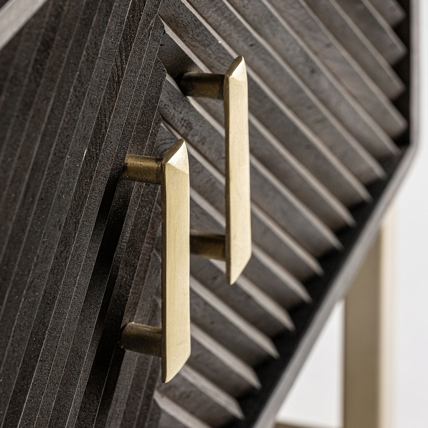 Тумба под телевизор KRAJ от VICAL home — это идеальное сочетание элегантности и функциональности. Этот несъемный предмет мебели размером 200x45x66 см, изготовленный из железа с деталями из дерева манго, предлагает впечатляющий контраст коричневого и золотого цветов, превращая вашу гостиную в эпицентр стиля.
