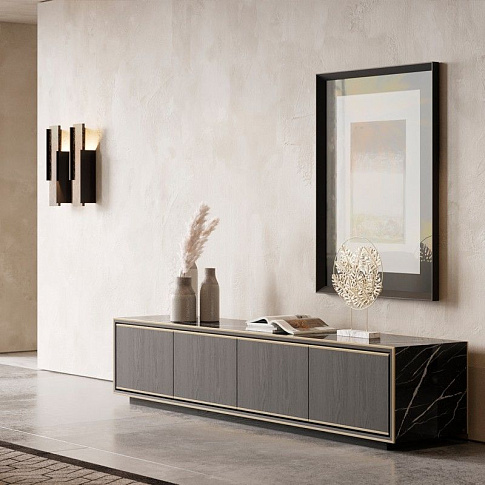 Rick – это современна тумба под телевизор с четырьмя дверями. Металлические детали придают ему роскошный вид. Может быть в деревянной или мраморной отделке.