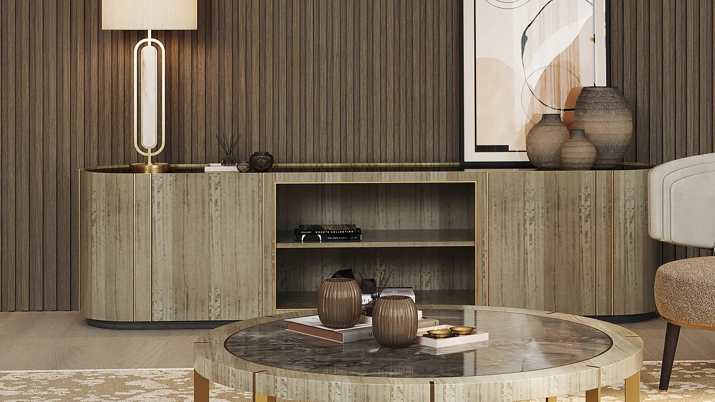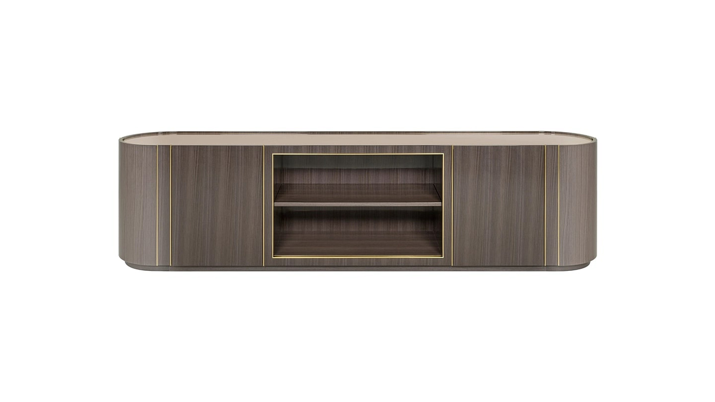 Самый обтекаемый из наших низкоуровневых телевизоров, многоцелевой BERGEN объединяет два скрытых шкафа с открытыми полками. Он имеет извилистую ромбовидную форму, изготовлен из деревянного шпона, матовой латуни и имеет зеркальную бронзовую поверхность.