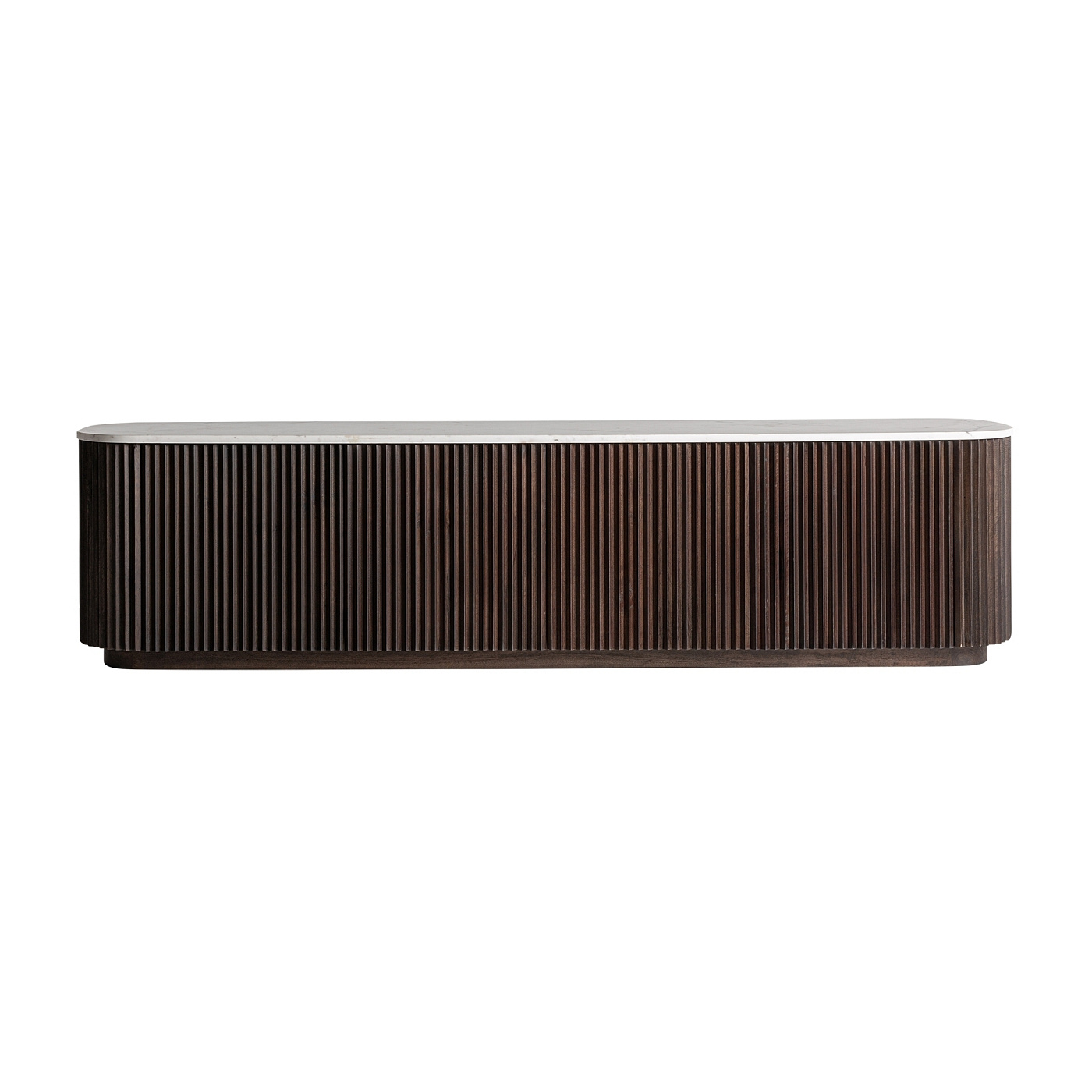 Тумба под телевизор Cenves, коричневого цвета, стиль арт-деко. Изготовлен из дерева манго в сочетании с мрамором.