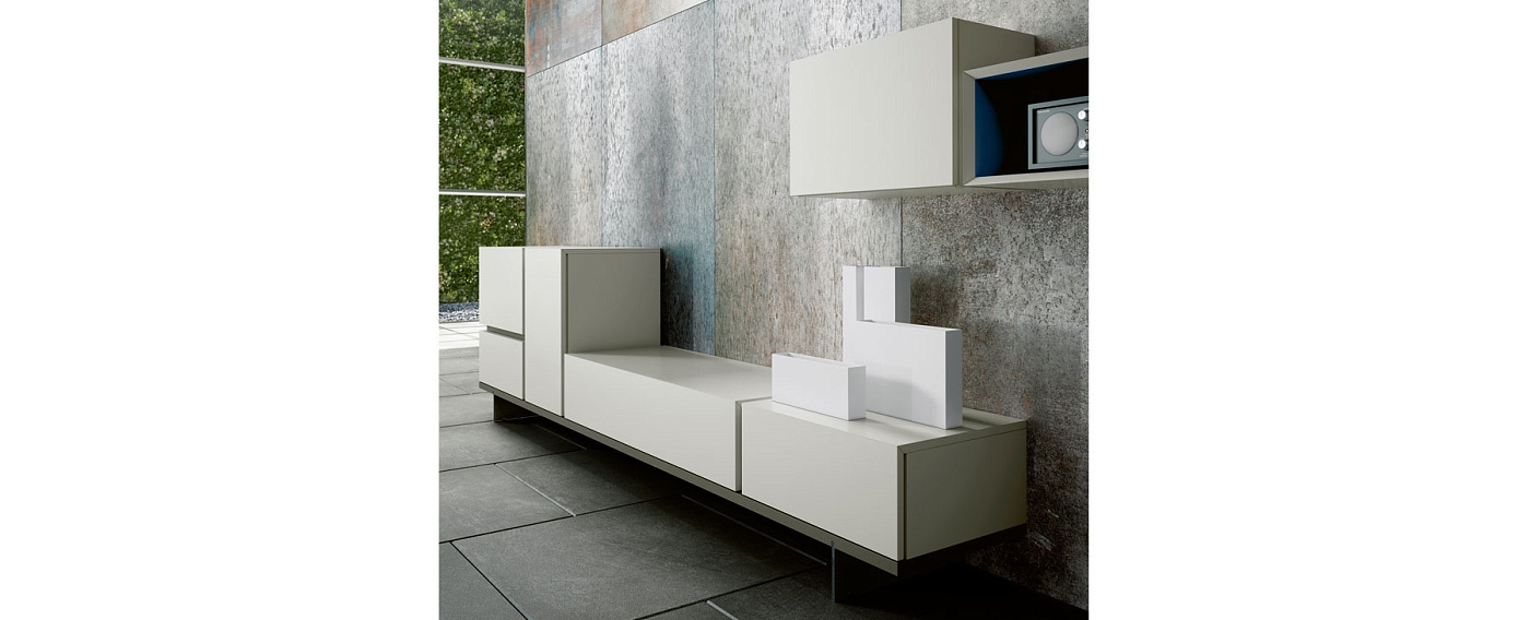 Эта мультимедийная комбинация сочетает в себе автономную установку с настенными блоками. Различные элементы, такие как выдвижные ящики и дверцы, опирающиеся на основание без ножек, создают эстетику ломаных линий. Особое внимание было уделено горизонтальным и вертикальным соединителям для создания пересечений между перпендикулярами.