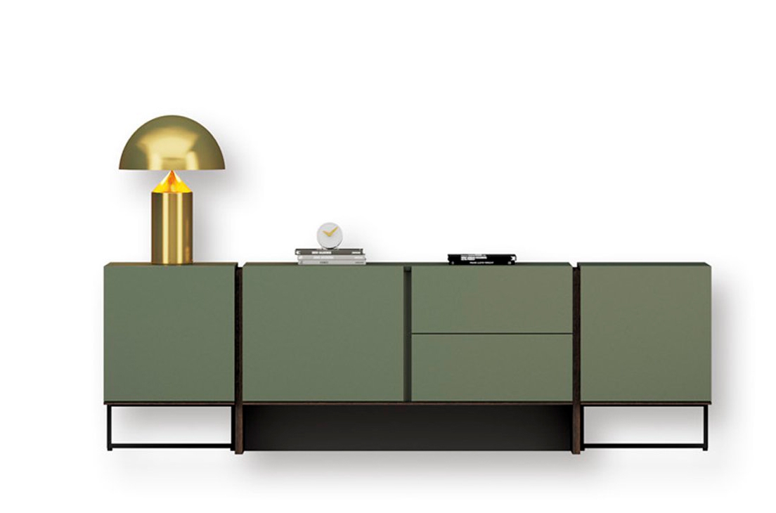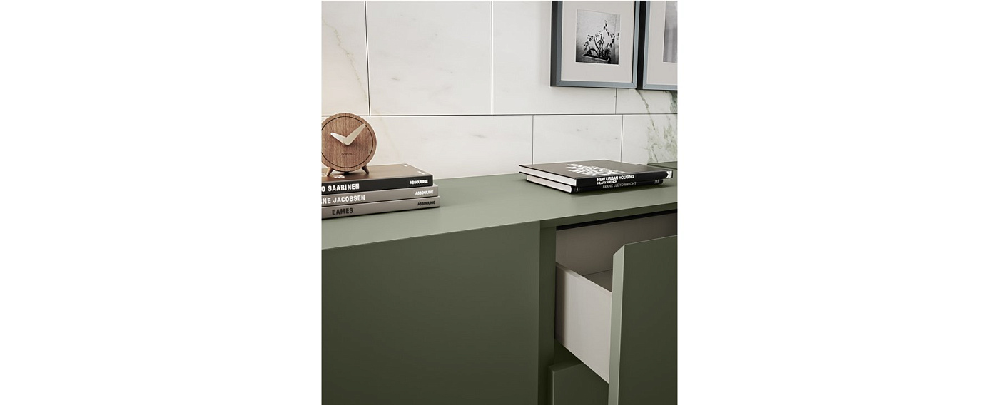 Симметрия в этом шкафу полностью соблюдена как в ножках, так и в модулях дверей и выдвижных ящиков верхней части. Высота указанного шкафа позволяет использовать его также как телевизионный модуль.