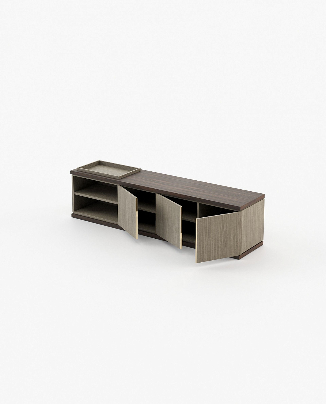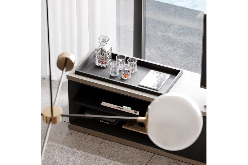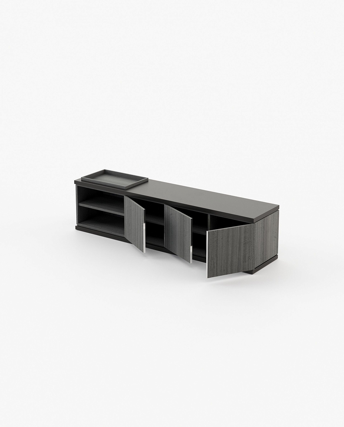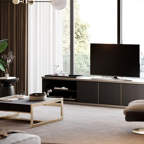 Тумба под телевизор Lora — это чисто вырезанная и функциональная вещь, идеально подходящая для хранения медиа. Она оснащена открытыми полками в левом отсеке для легкого доступа к компонентам медиа и может быть персонализирована с использованием различных вариантов из стали и дерева.