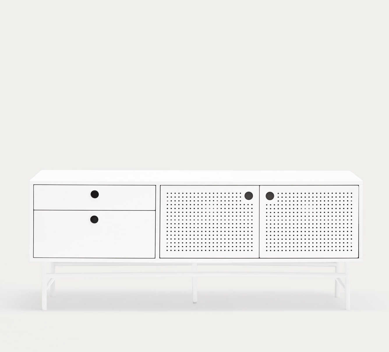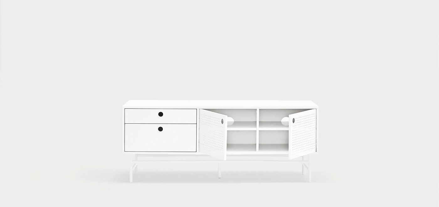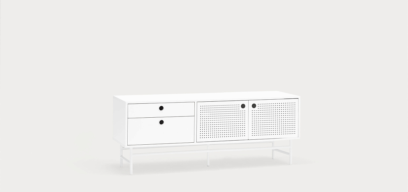 Тумба под телевизор Punto, оформленная в индустриальном стиле, сочетает в себе эти эстетические концепции с дизайном и функциональностью. Коллекция отличается перфорированными металлическими дверцами со встроенными круглыми ручками. Корпус выполнен в лакированном МДФ различных цветов.