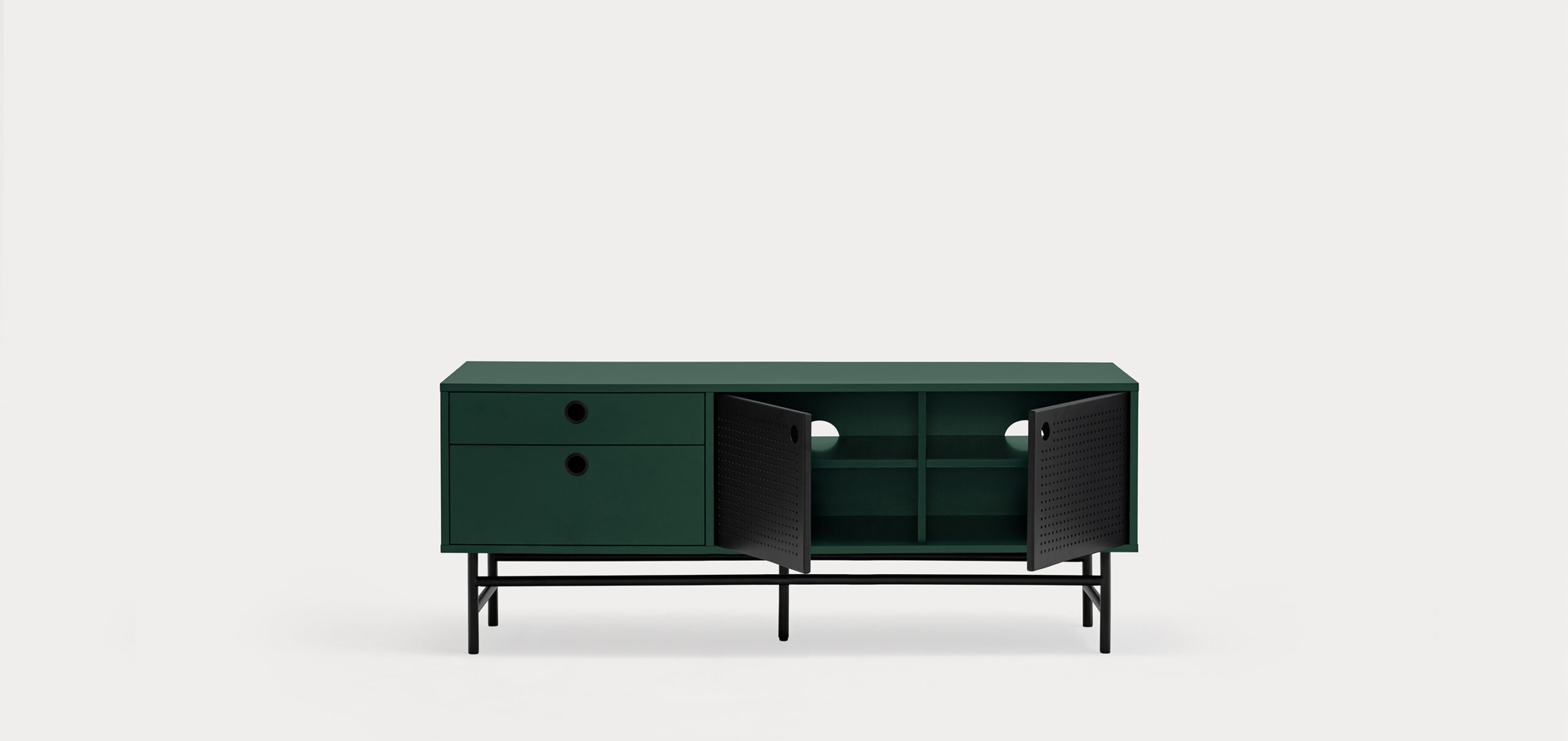 Тумба под телевизор Punto, оформленная в индустриальном стиле, сочетает в себе эти эстетические концепции с дизайном и функциональностью. Коллекция отличается перфорированными металлическими дверцами со встроенными круглыми ручками. Корпус выполнен в лакированном МДФ различных цветов.