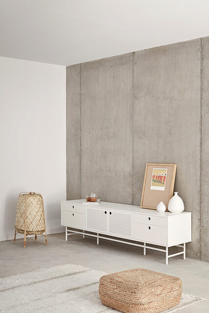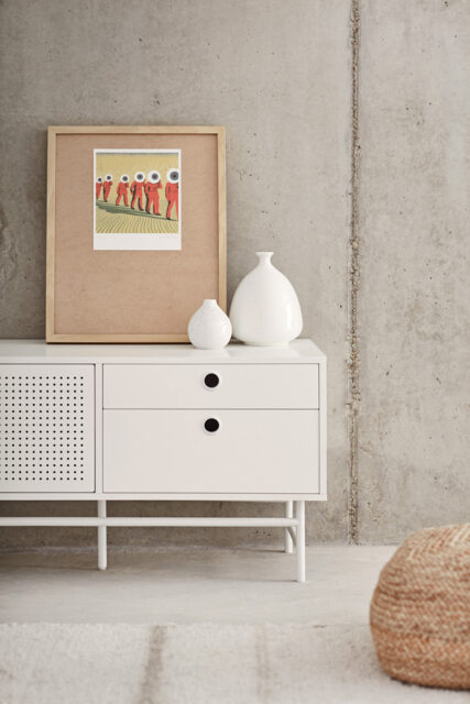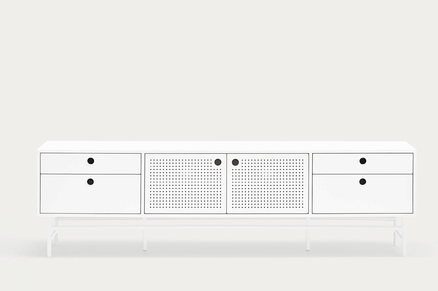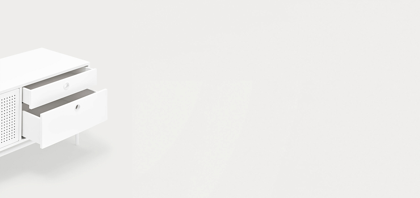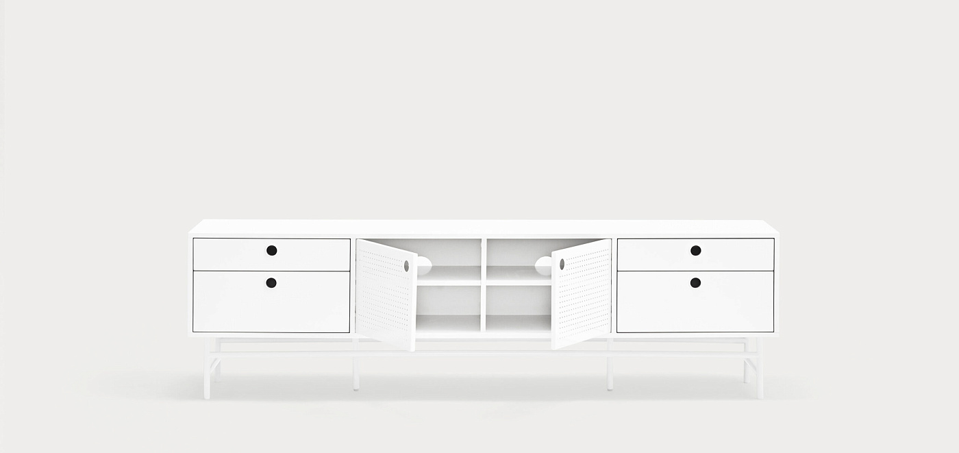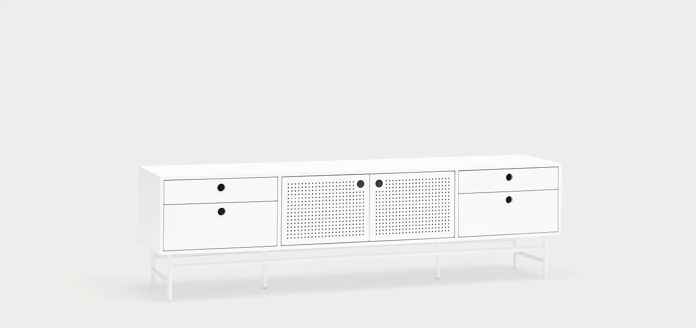 Тумба под телевизор Punto, оформленная в индустриальном стиле, сочетает в себе эти эстетические концепции с дизайном и функциональностью. Коллекция отличается перфорированными металлическими дверцами со встроенными круглыми ручками. Корпус выполнен в лакированном МДФ различных цветов.