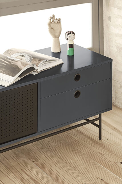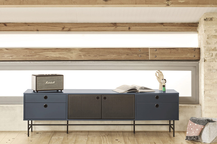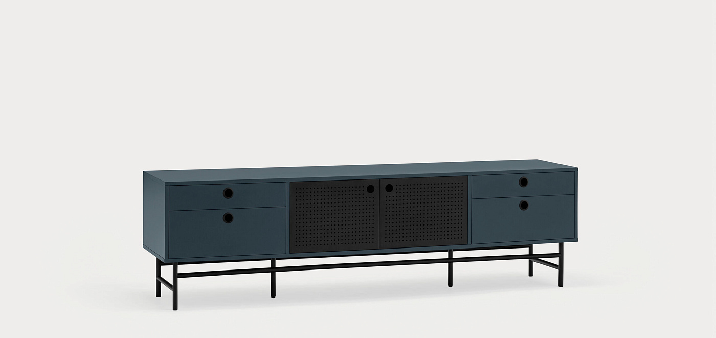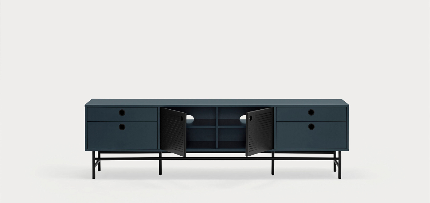 Тумба под телевизор Punto, оформленная в индустриальном стиле, сочетает в себе эти эстетические концепции с дизайном и функциональностью. Коллекция отличается перфорированными металлическими дверцами со встроенными круглыми ручками. Корпус выполнен в лакированном МДФ различных цветов.