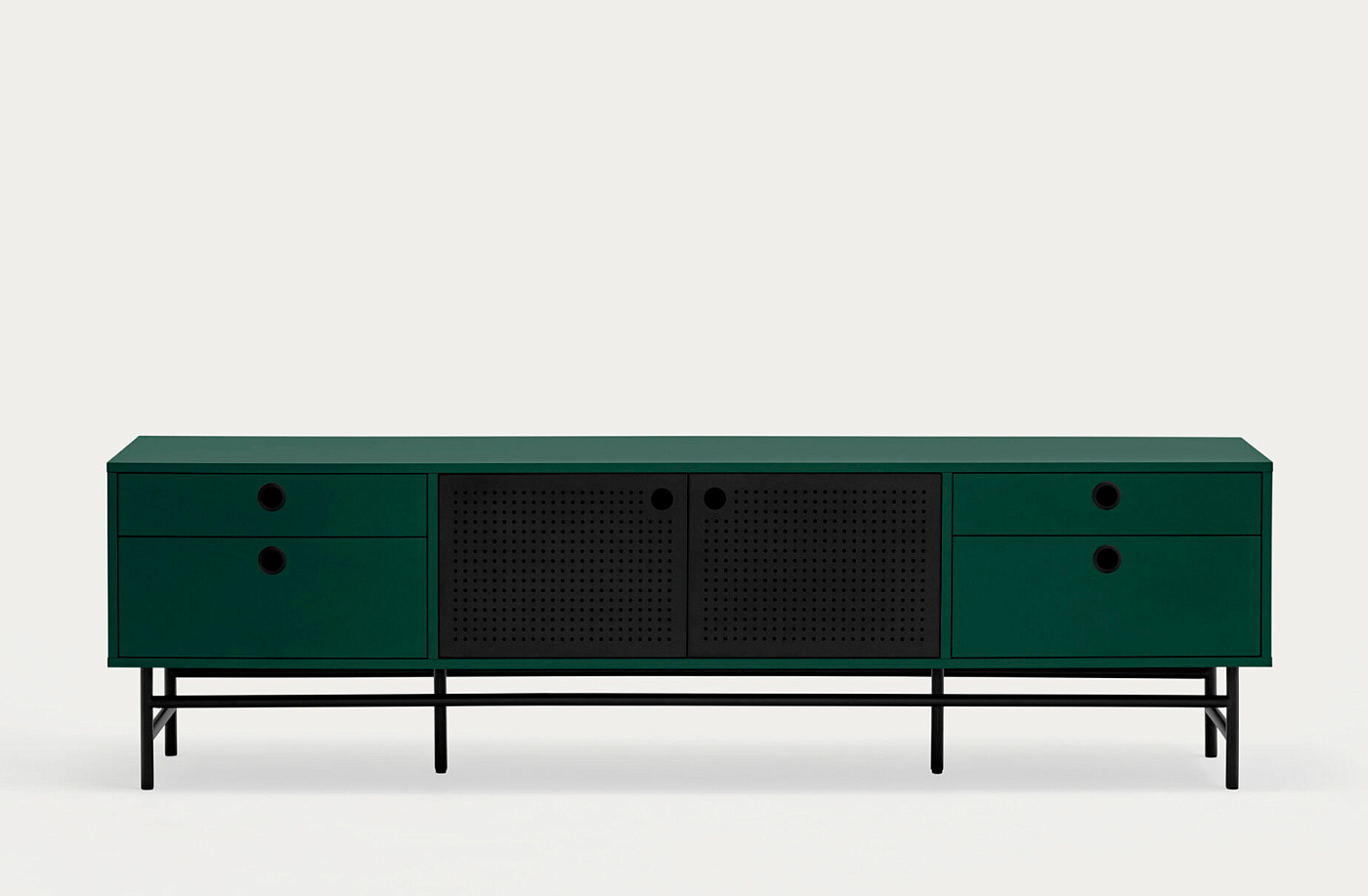 Тумба под телевизор Punto, оформленная в индустриальном стиле, сочетает в себе эти эстетические концепции с дизайном и функциональностью. Коллекция отличается перфорированными металлическими дверцами со встроенными круглыми ручками. Корпус выполнен в лакированном МДФ различных цветов.