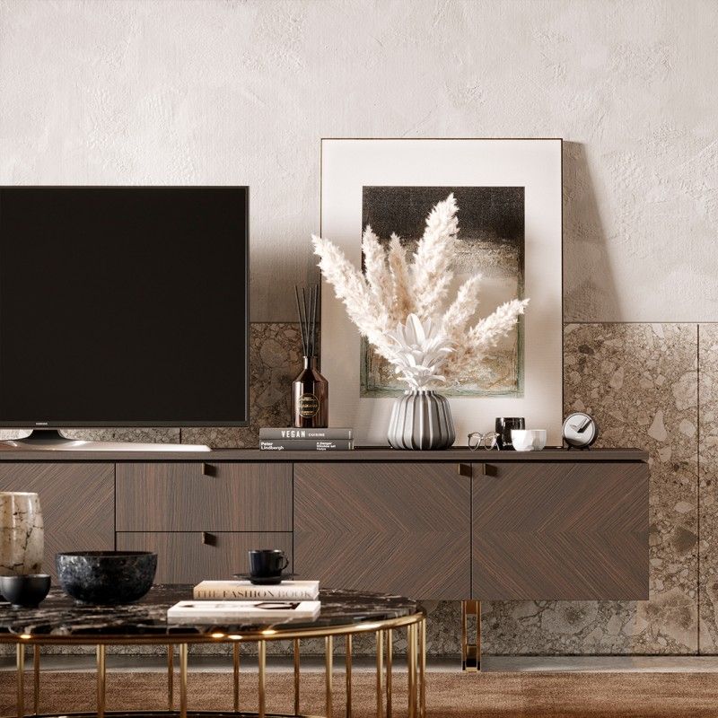 Тумба под телевизор из коллекции Boris, представляет собой современную мебель, представленную здесь в дерево эвкалипте и золотыми ножками из нержавеющей стали. Упрощенный дизайн, способный хранить все, что вам необходимо, благодаря четырем дверям и двум выдвижным ящикам. Просмотр телевизора может быть стильным.