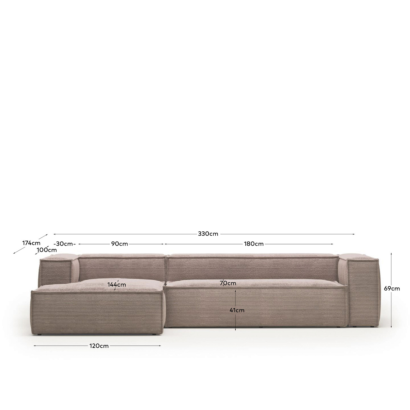 Диван 3х местный Blok с левым шезлонгом розовый вельвет 330 см