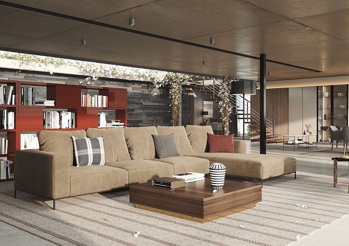 Jolson — низкий диван, щедрых пропорций, простой формы и элегантных ножек. Модуль шезлонга можно использовать с любой стороны, а вместе с настраиваемой обивкой получается гибкое решение для сидения.