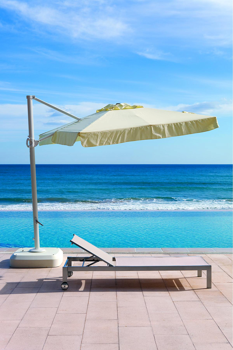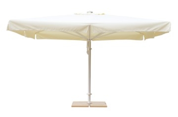 Квадратный зонт OMBRA 400 х 400 см. Крышка из лакированной алюминиевой рамы и образца тканей Point или из ткани Batyline 35, 36 или 57. Лакированная алюминиевая основа с керамической плиткой весом 35 кг каждая.