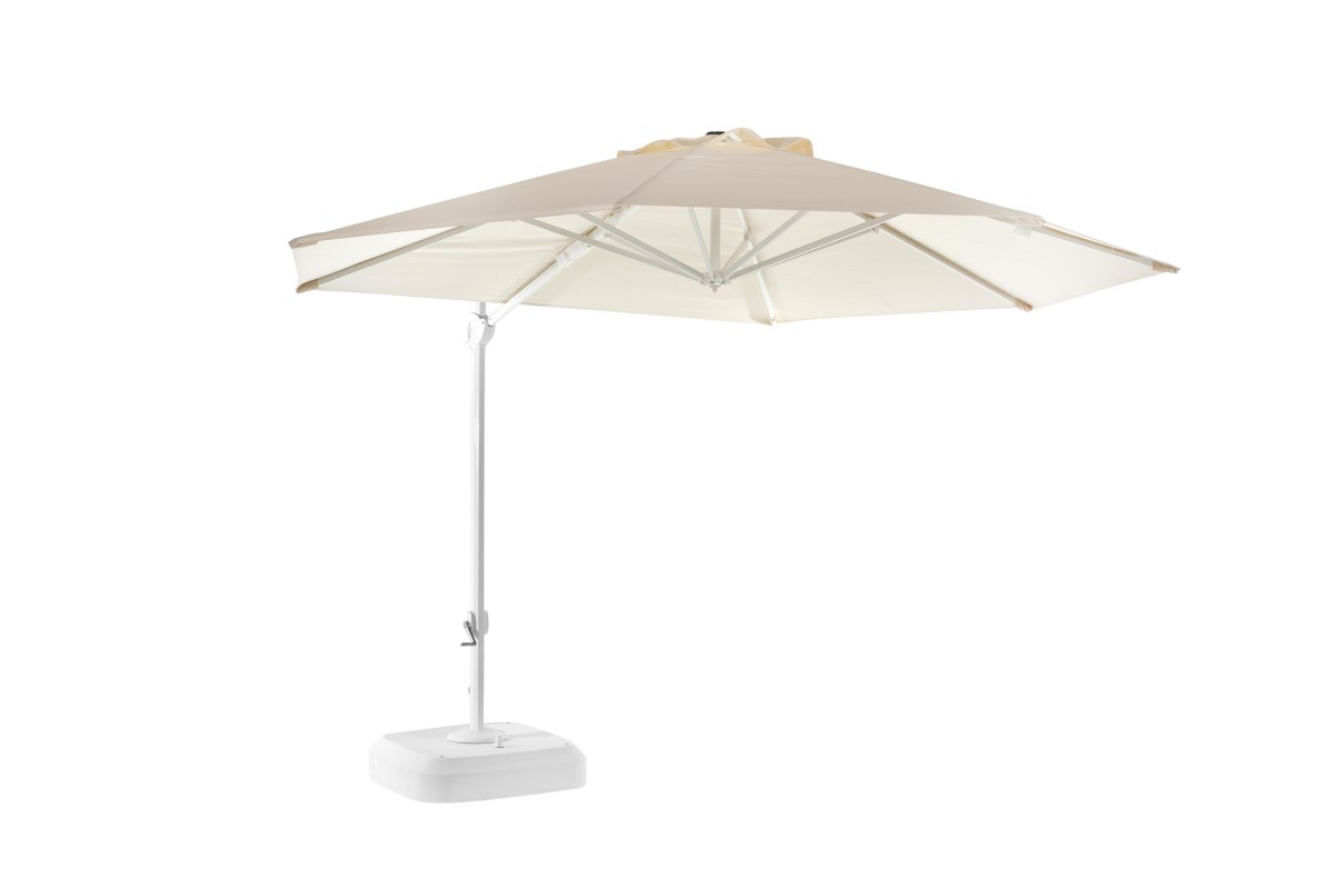 Зонт диаметром 350 сантиметров. Тканевая обивка рамы из лакированного алюминия 21 из книги образцов Point или ткань Batyline 35, 37, 38, 39, 40 или 57. Основание рамы из лакированного алюминия и ножки из ПВХ с колесами.