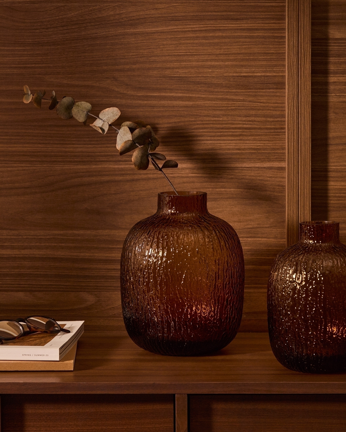 Ваза полностью сделана из стекла коричневого цвета. Форма в виде сосуда с узким горлом имеет средиземноморский след, что сейчас актуально в дизайне.