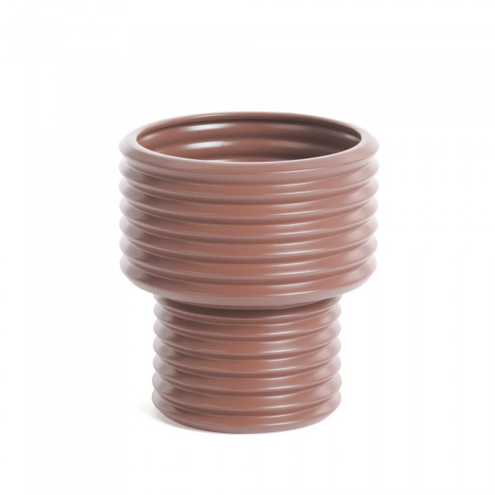 Ваза полностью сделана из доломита. Это природный материал, родственный керамике. Он не портится от влаги, солнца, перегрева и других негативных внешних воздействий. Поверхность окрашена глянцевой краской землисто-коричневого цвета. Покрытие улучшает внешний вид и обеспечивает легкую чистку. Симметричная геометрическая форма обеспечивает устойчивость, даже несмотря на «перевернутый» вид.