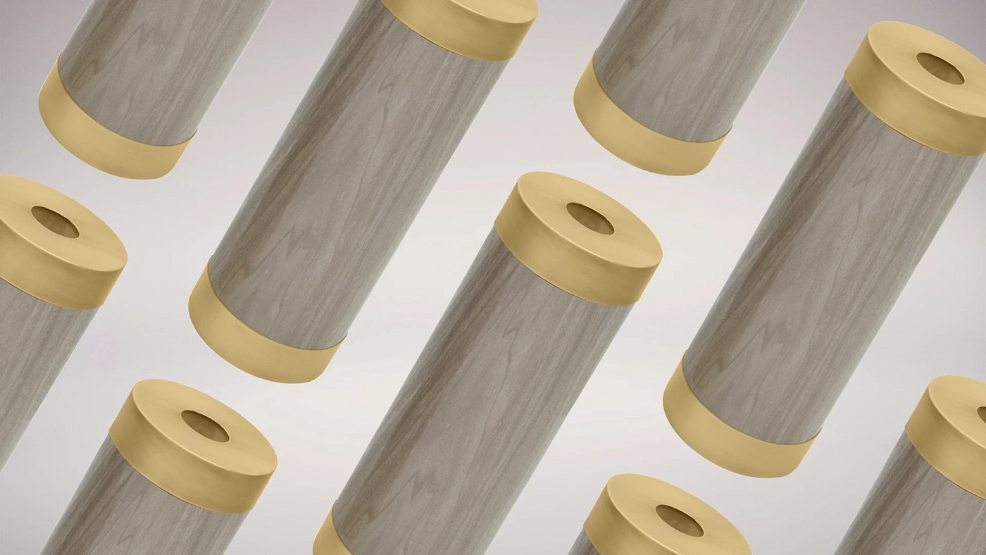 Цилиндрическая ваза NAIROBI, предназначенная для демонстрации одного цветка, изготовлена из глянцевого деревянного шпона и отделана матовыми латунными торцами.