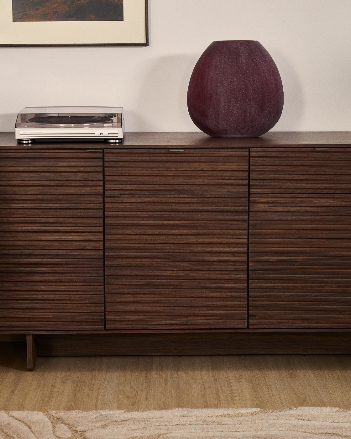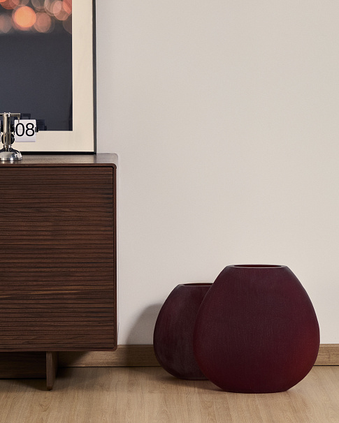 Ваза полностью сделана из толстого стекла, которое окрашено матовой краской в розово-бордовый цвет. Покрытие неоднородное, за счет чего на поверхности образуются блики, придающие эффект фактурности.