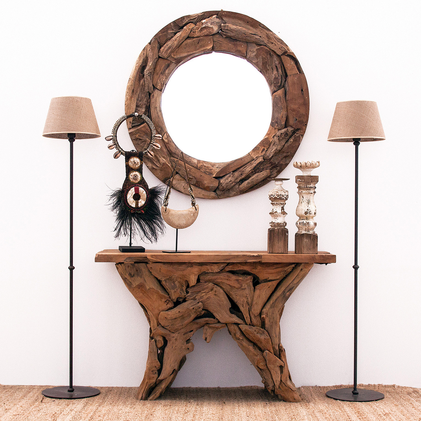 Зеркало TSUMEB круглое, состаренного натурального цвета, в этническом стиле. Изготовлен из тикового дерева в сочетании со стеклом.