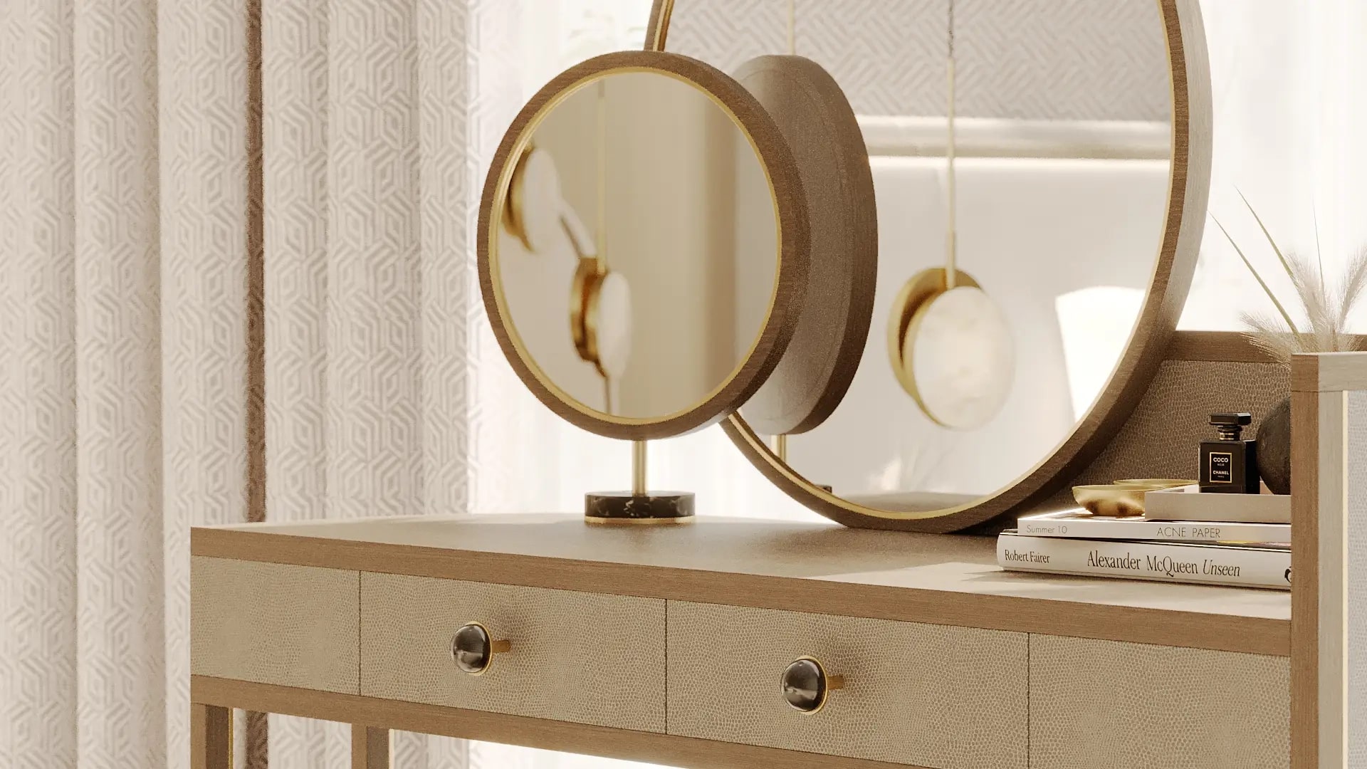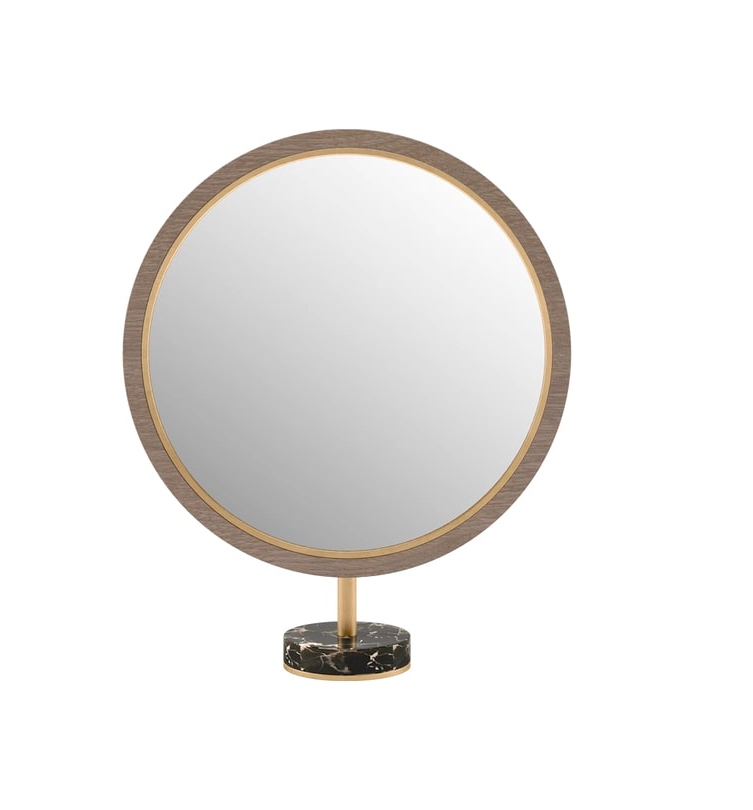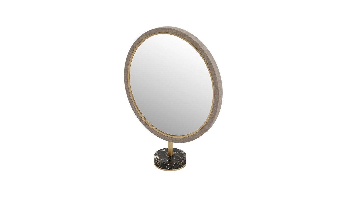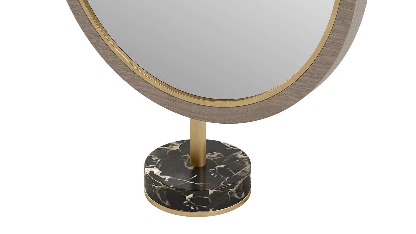 Отдельно стоящий зеркальный шкаф PARMA выполнен в классическом стиле и имеет круглое зеркало с окантовкой из матовой латуни и деревянного шпона, ножку из травленой латуни и утяжеленное основание из камня, нанесенного поверх матовой латуни.